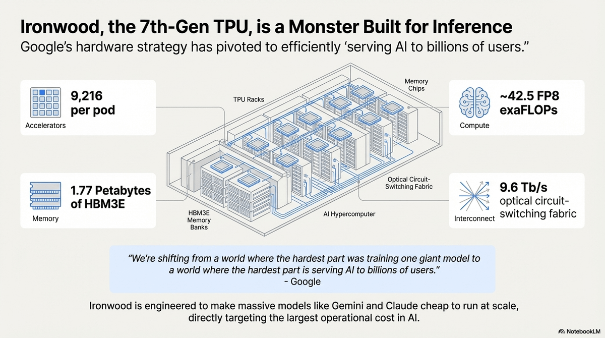 That memory pool and interconnect matter more than peak FLOPs. Large inference workloads are memory-bandwidth bound. Ironwood is designed around that reality.