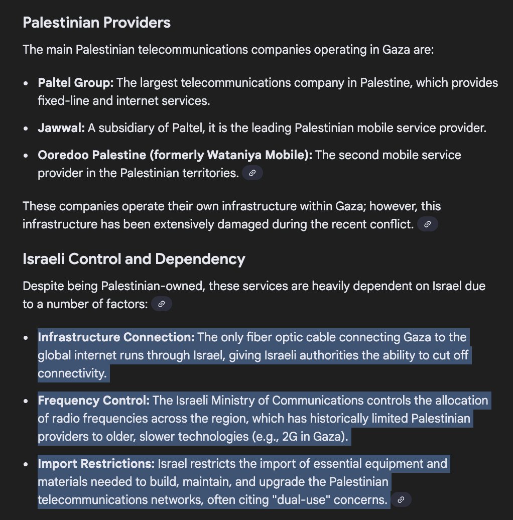 Gaza has no sovereign phone networks, no independent ISPs, no separate telecom grid.