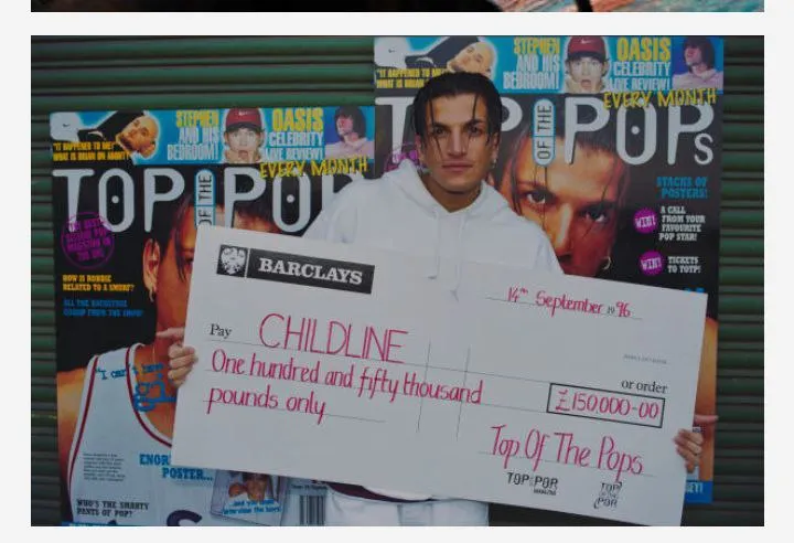 English singer Peter Andre holds an oversized cheque from Top of the Pops magazine payable to the Childline counselling service at a press call in London in September 1996.