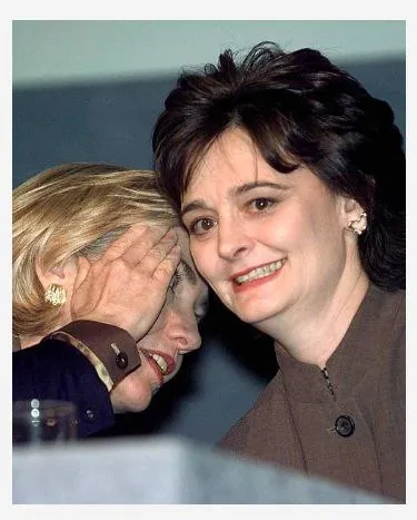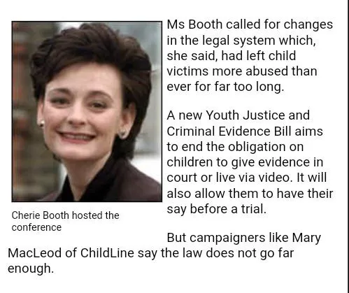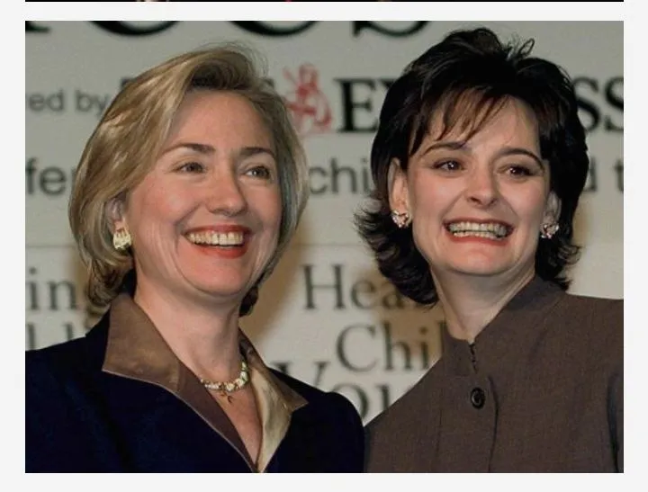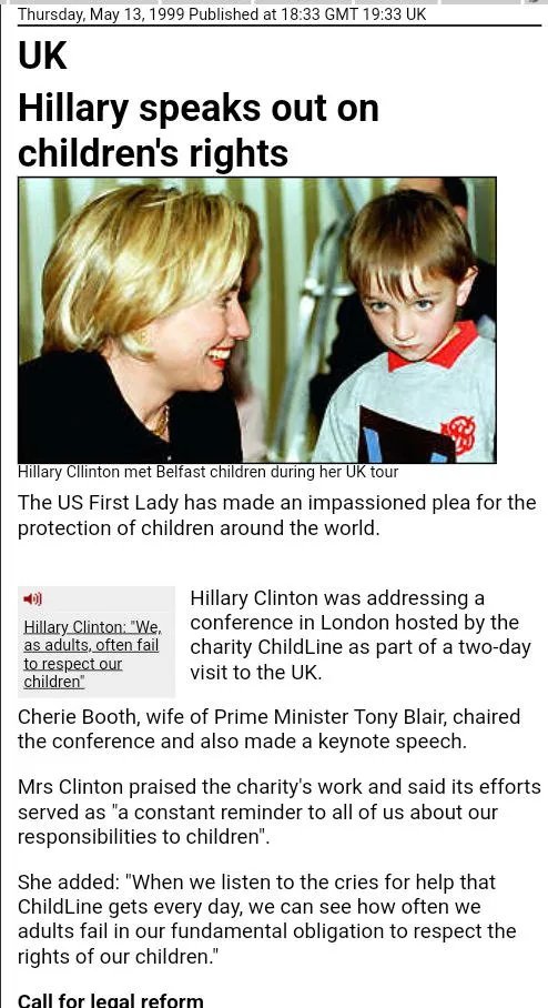 Killary Clinton and Tony Blair’s ‘wife’, Cherie Booth (Big Cherie), stand together on stage at the beginning of the Childline Conference on Children and the Law in London 13 May 1999. The two women participated in the conference focusing on ‘obstacles to justice faced by children in abuse cases….’ 🤔🙄
