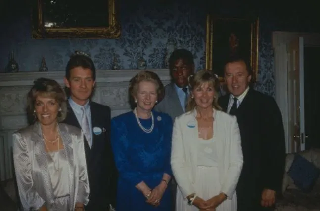 37. Celebrities at a reception for phone charity Childline at Number 10 Downing Street, London, 2nd July 1987. From left to right, television presenter Esther Rantzen, actor Anthony Andrews, Prime Minister Margaret Thatcher, boxer Frank Bruno, actress Susan Hampshire and journalist David Frost.