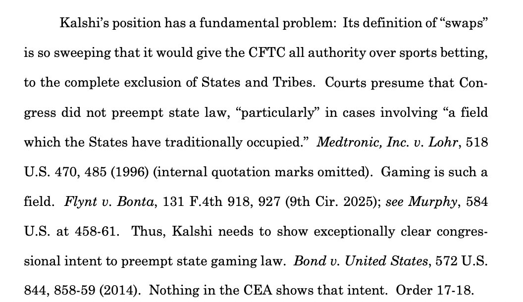 Nevada: "Thus, Kalshi needs to show exceptionally clear congressional intent to preempt state gaming law. Nothing in the CEA shows that intent."