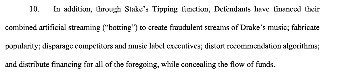 "Through Stake’s Tipping function, Defendants have financed their combined artificial streaming to create fraudulent streams of Drake’s music; fabricate popularity; disparage competitors and music label executives; and distort recommendation algorithms."