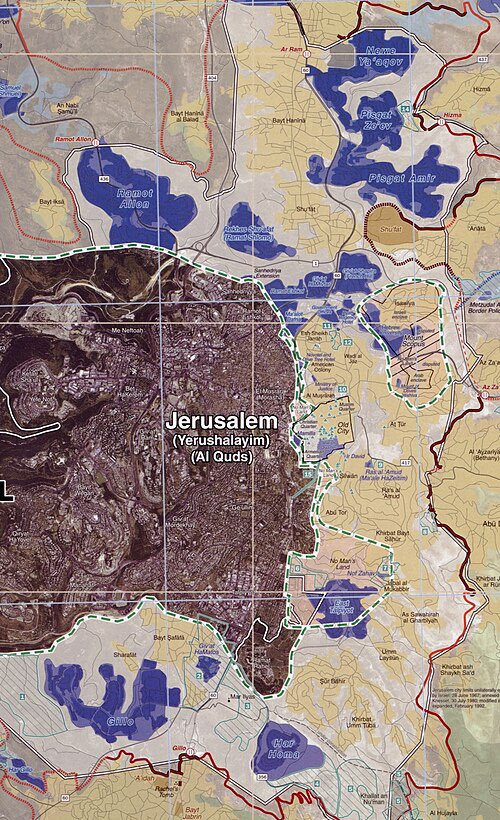 Ramot è uno degli otto famosi “insediamenti ad anello” concepiti negli anni Settanta: otto insediamenti illegali intorno a Gerusalemme (in blu nella foto) per “proteggere” la terra rubata, usurpata, espropriata, strappata con la violenza alla popolazione nativa palestinese.