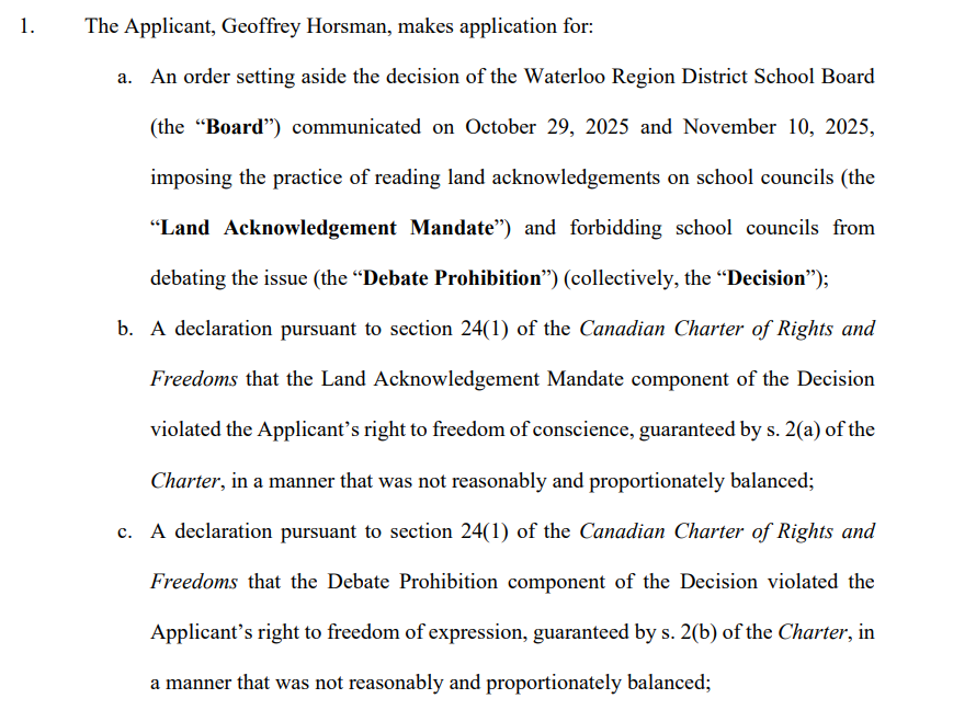 And so, one parent decided to file a charter rights challenge on the basis that land acknowledgements are racist and imposing them violate his right to freedom of conscience.