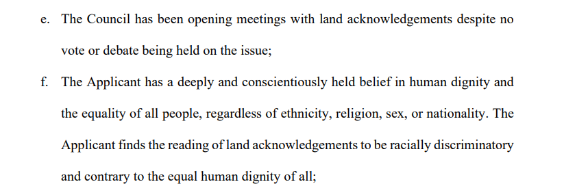 4/ According to the JCCF. Geoff Horseman (the applicant) "has a deeply and conscientiously held belief in human dignity and the equality of all people, regardless of ethnicity, religion, sex, or nationality. The Applicant finds the reading of land acknowledgements to be racially discriminatory and contrary to the equal human dignity of all."