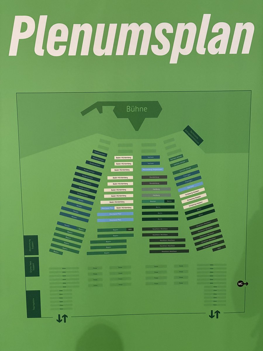 Plattegrond van de zaal. Je ziet meteen waar de Groenen groot zijn en waar niet. Niet in Meckelenburg-Vorpommeren in ieder geval.