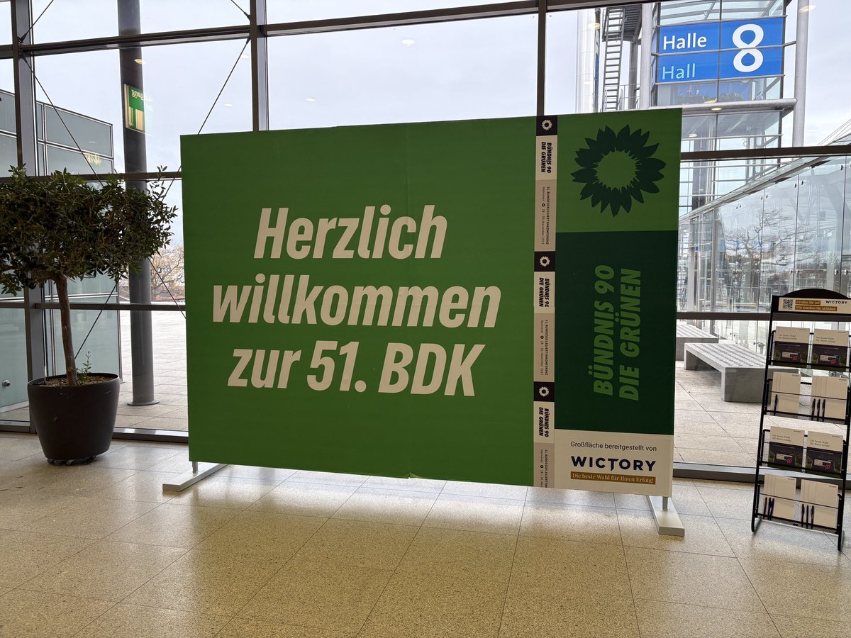 De Groenen zitten tegenwoordig in de oppositie en verloren bij de Bondsdagverkiezingen eerder dit jaar. Soort vraag: hoe de weg omhoog te vinden? Congres begint zo. Er loopt nu een soort klokje af.