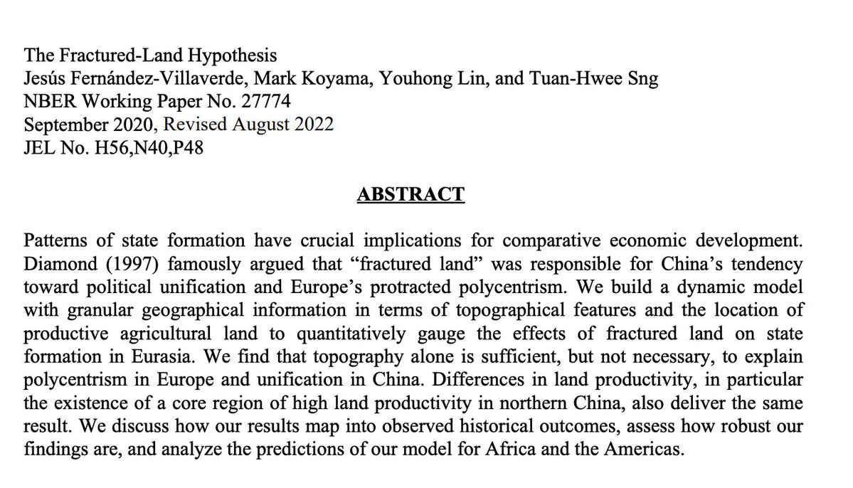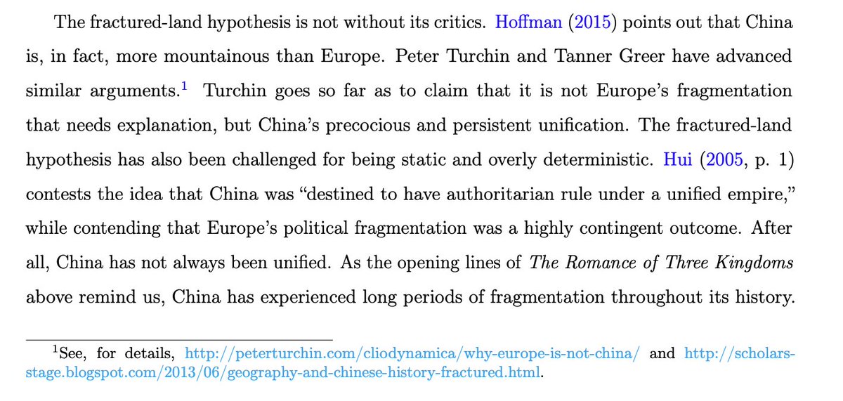 Before I came across this paper I had already encountered the critiques of Diamond's fractured land hypothesis by Hoffman (2015), Hui (2005), and Turchin & Greer. Many new comers (eg Huang 2023) have piled on. But IMO all are wanting.