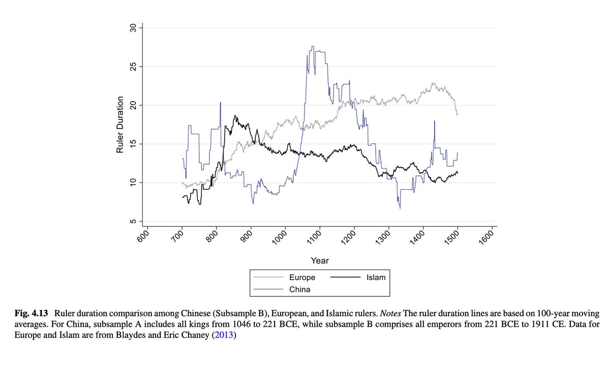 In contrast to some recent accounts (The Rise and Fall of the EAST), the data on ruler longevity here don't appear to show secular increase over time. Image