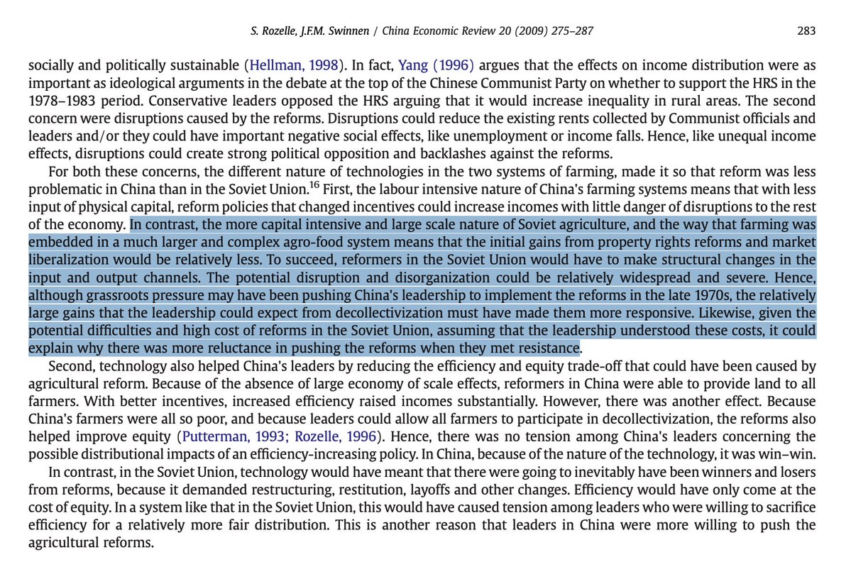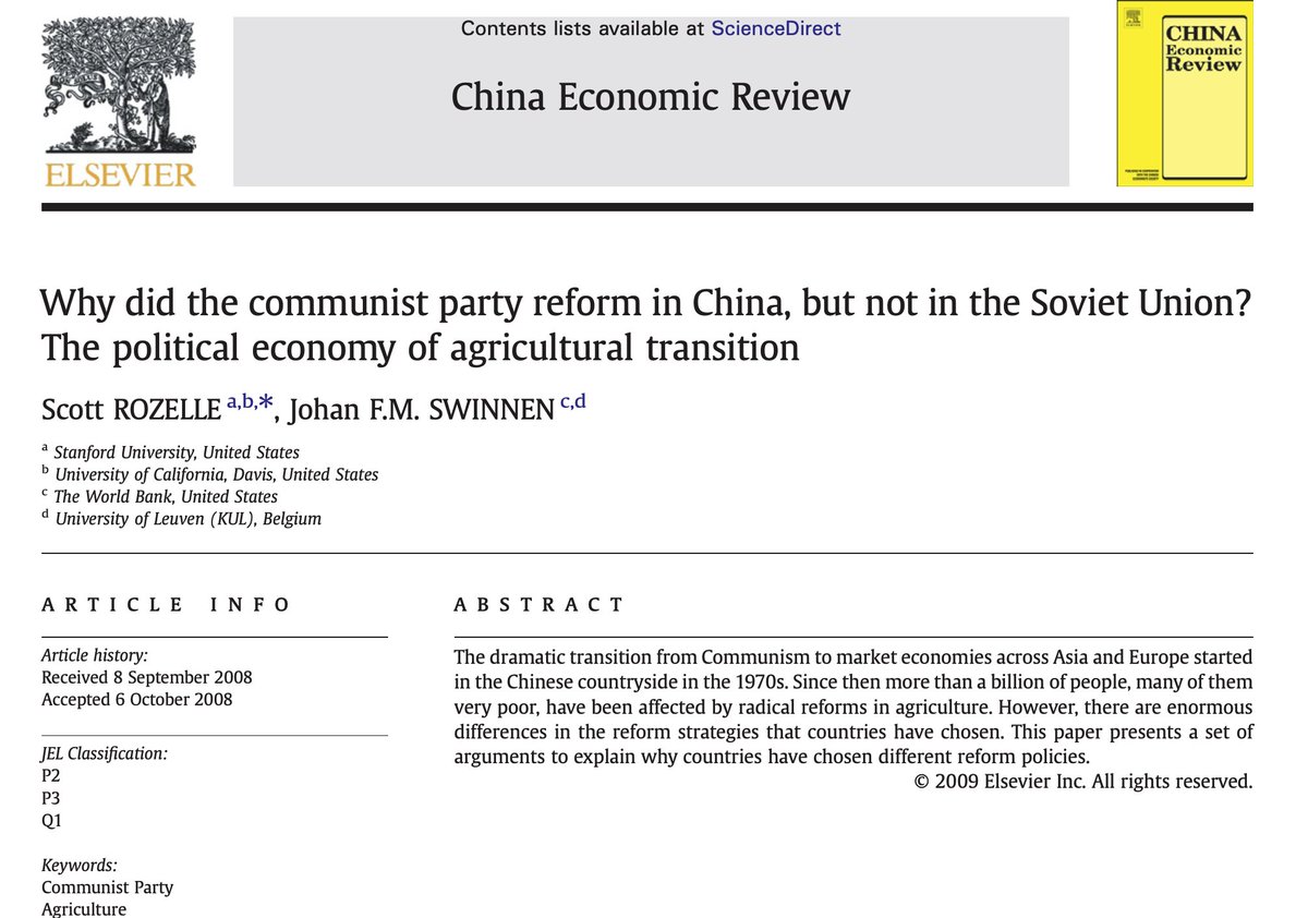 Great summary of political economy of farm sector reform. The real incentives and constraints. Rozelle & Swinnen, “Why Did the Communist Party Reform in China, but Not in the Soviet Union?” (2009)