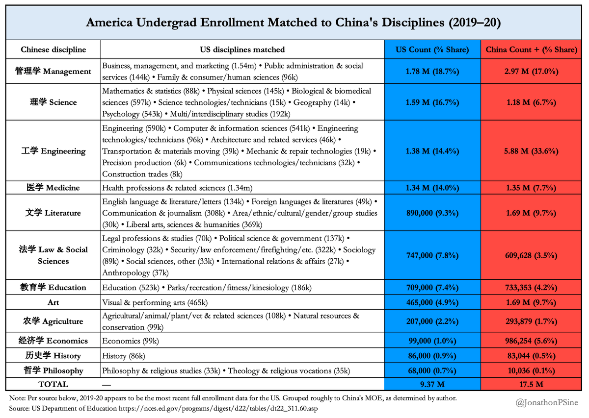 I re-grouped US college majors by Chinese disciplines to allow for rough comparison.