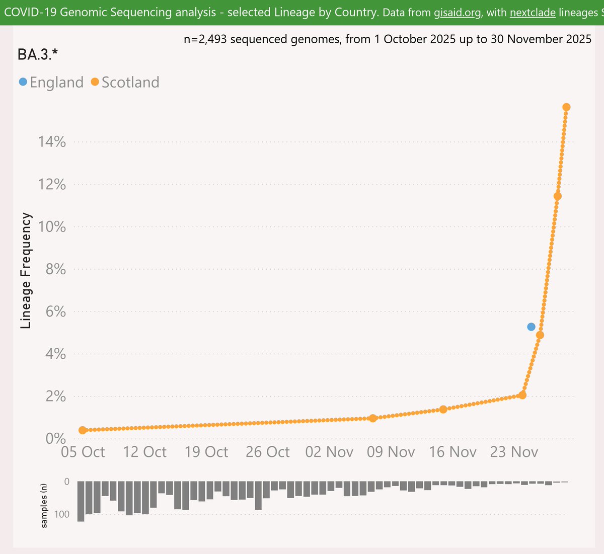 BA.3.2.* accelerated sharply in Scotland to 16% of recent samples.