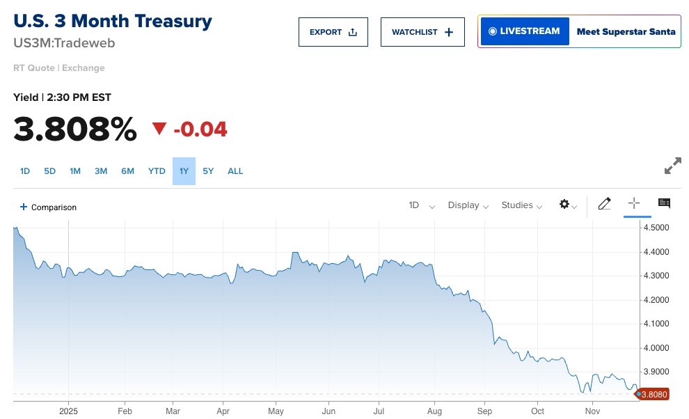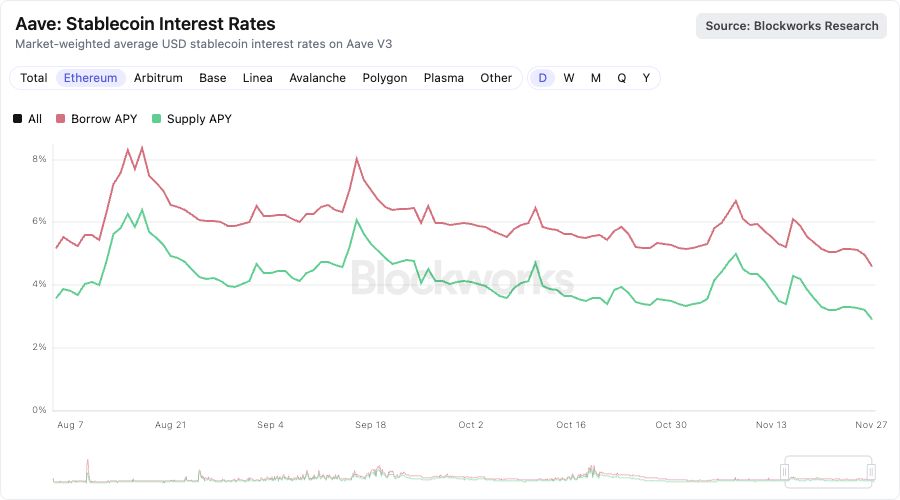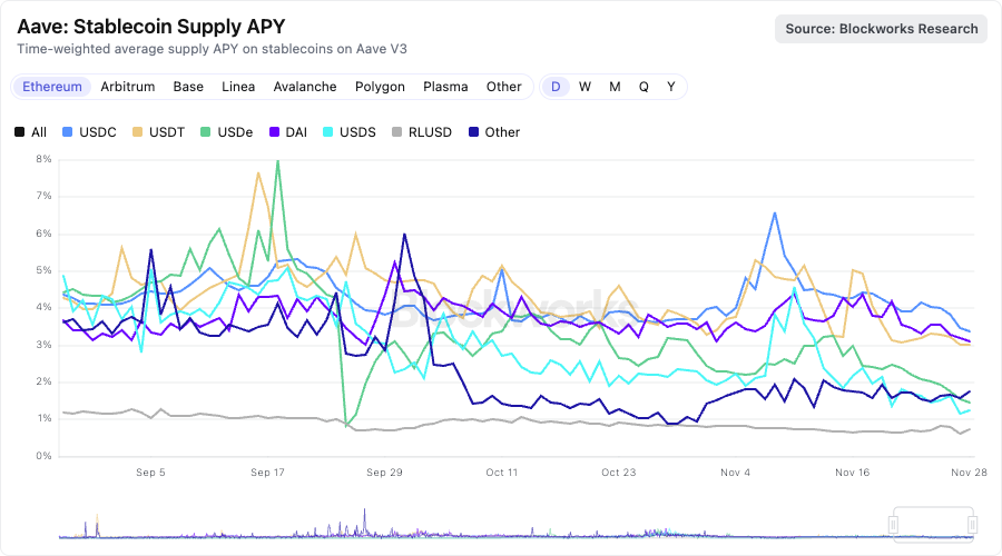 Stablecoin supply APYs on Aave's Ethereum market have fallen from an average of about 5% in late Summer to just above 3% now.