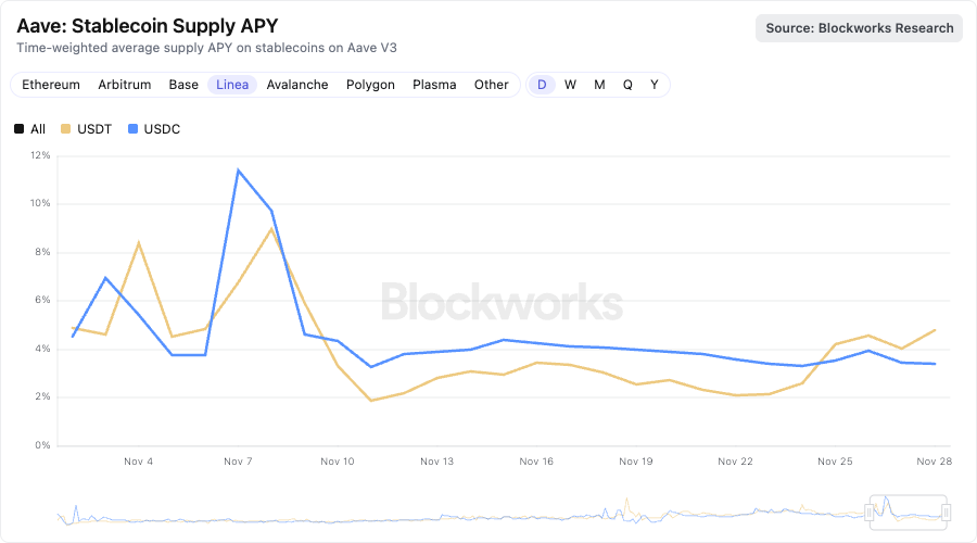 For those willing to bridge to other chains, there are a few opportunities to earn slightly higher yields. For example USDT is earning 4.8% on Linea vs 3.2% on Ethereum.
