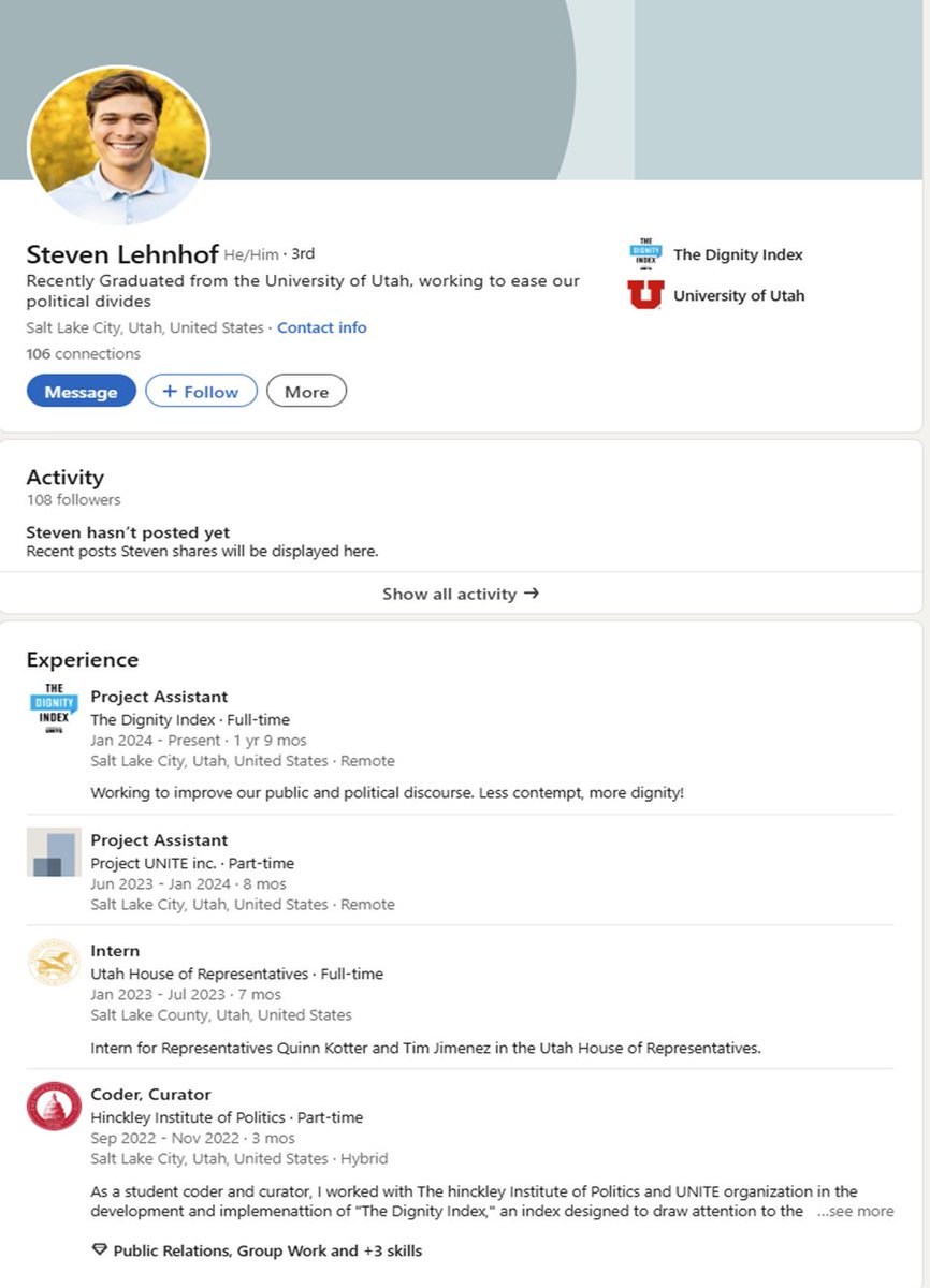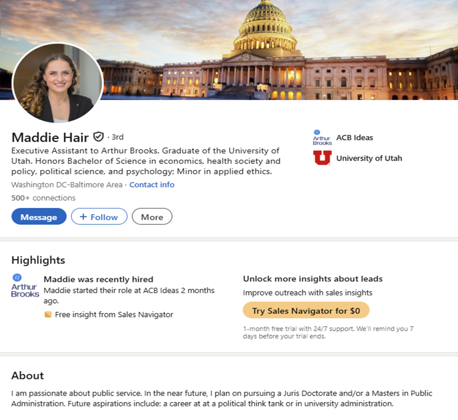 Maddie interned with the Utah House of Representatives and the Governor's Office of Planning and Budget. She also interned at a political consulting company. Up until recently, she worked social media and as program associate for Dignity Index. She was a founding member and the first President of Students for Dignity at U of U. Maddie now works in DC at ACB Ideas, a company furthering the ideas of Arthur Brooks, who wrote the book on saving America from the culture of contempt. Maddie's future ambitions include a career either at a political think tank or in university administration.