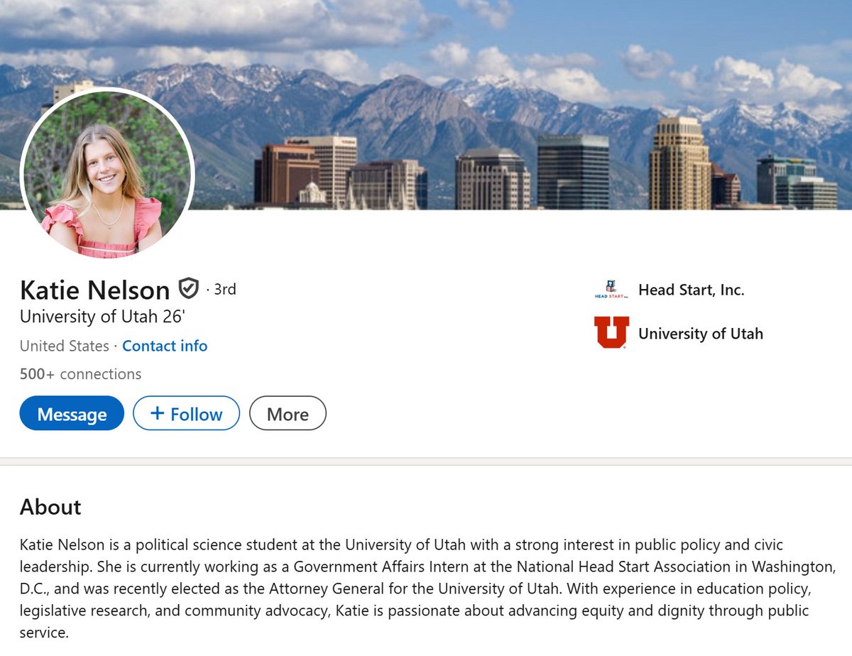 Katie interned with the Utah State Board of Education and the Utah House of Representatives. She is currently interning in DC at the National Head Start Association, an organization that promotes early childhood education.