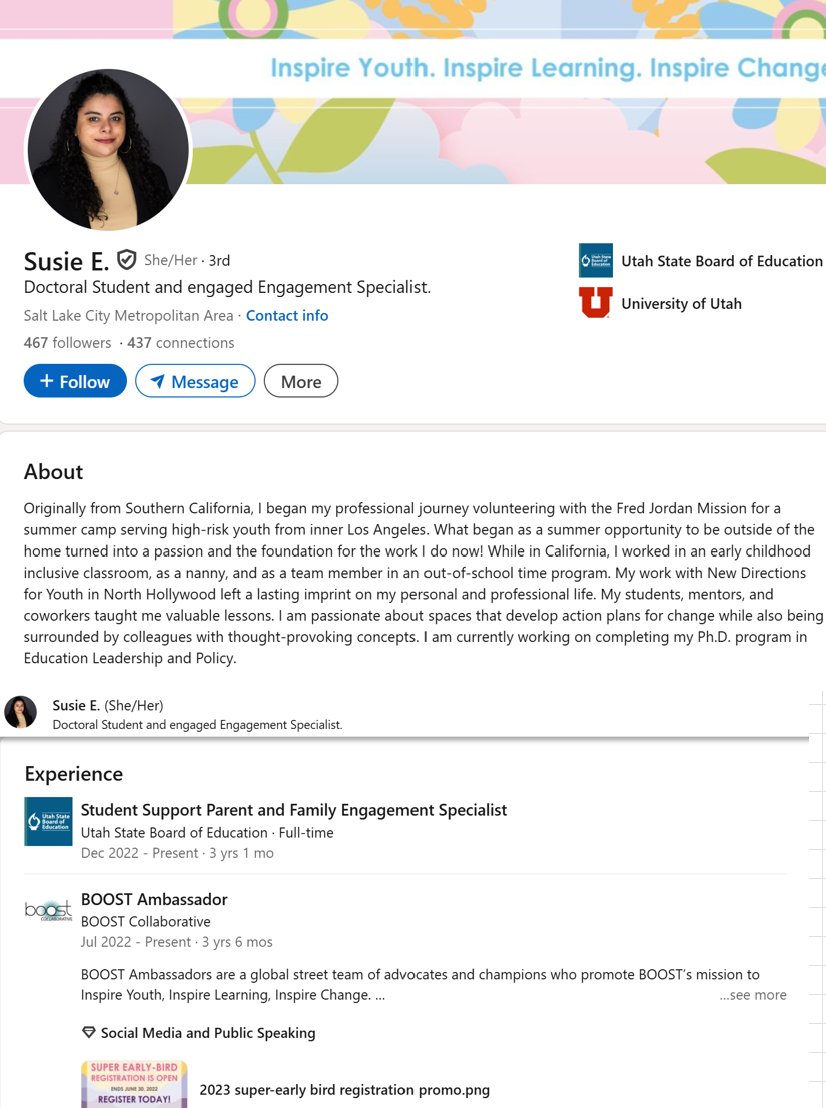 Susie (she/her) is currently employed by the Utah State Board of Education and works as an ambassador for Boost Collaborative. Boost Collaborative's pet project, @MARS4GOOD, is loaded with anti-Trump, anti-Republican sentiments, including a cartoon of "little Trump supporters" depicted as Nazis and KKK members.