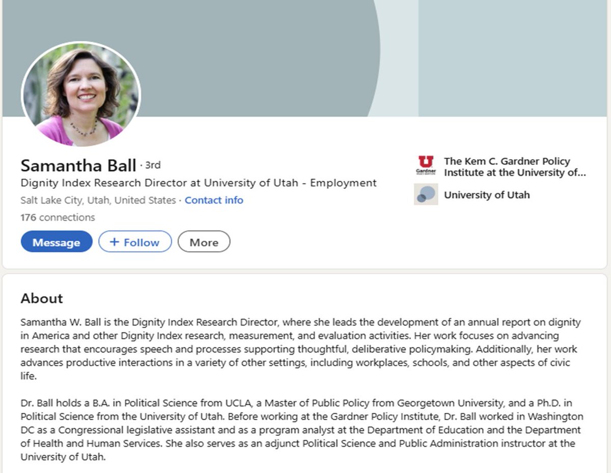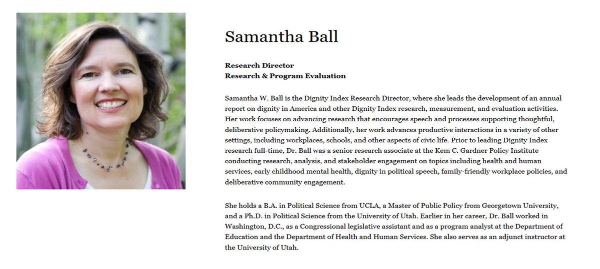 Additionally, Samantha Ball, Senior Research Associate at the University of Utah is also employed with Dignity Index as their Research Director, having worked for both the US Department of Education and Department of Health and Human Services in DC previously.