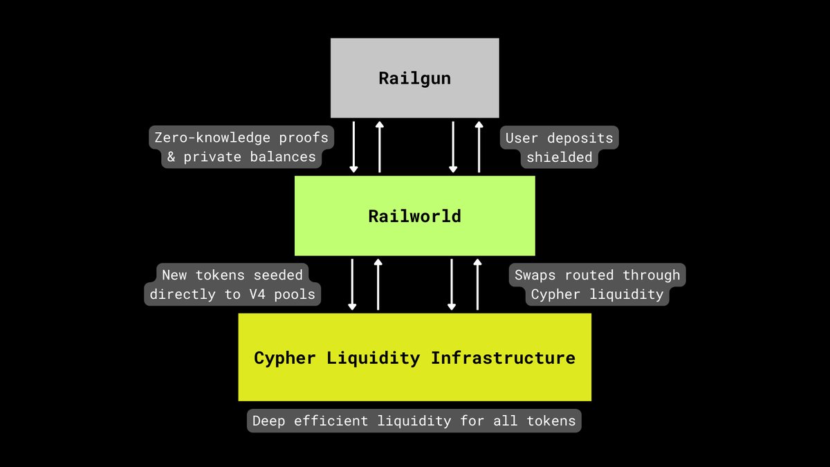 @railworldtrade builds permissionlessly on Railgun tech to bring privacy to Cypher’s liquidity pools, including new token launches that are seeded on the v4 AMM.
