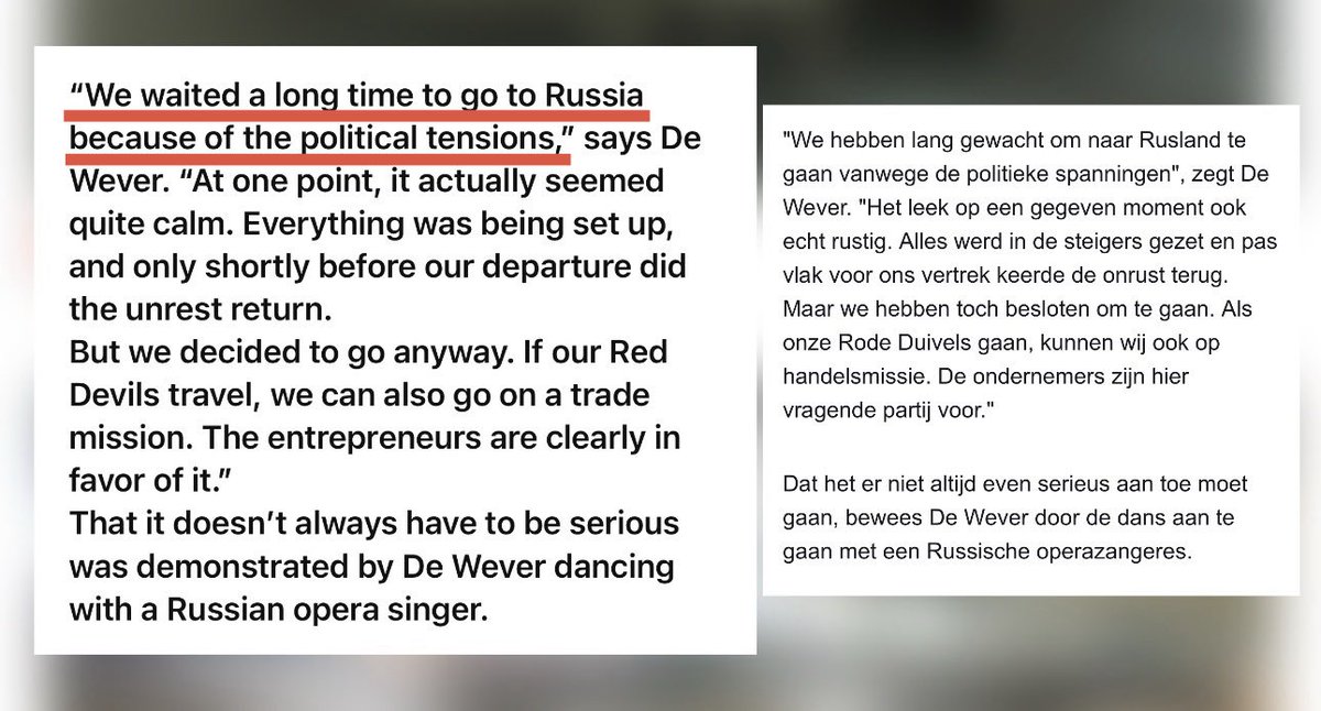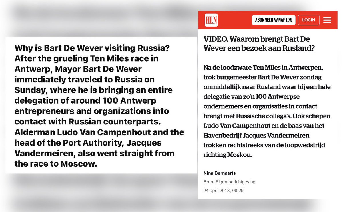 In April 2018, in the midst of increasing sanctions, Antwerp politician Bart De Wever visited Moscow. During this visit, De Wever and Mayor Sergey Sobyanin signed a comprehensive cooperation program. He also brought a large delegation of around 100 business representatives and organizations to deepen exchanges with their Russian counterparts.