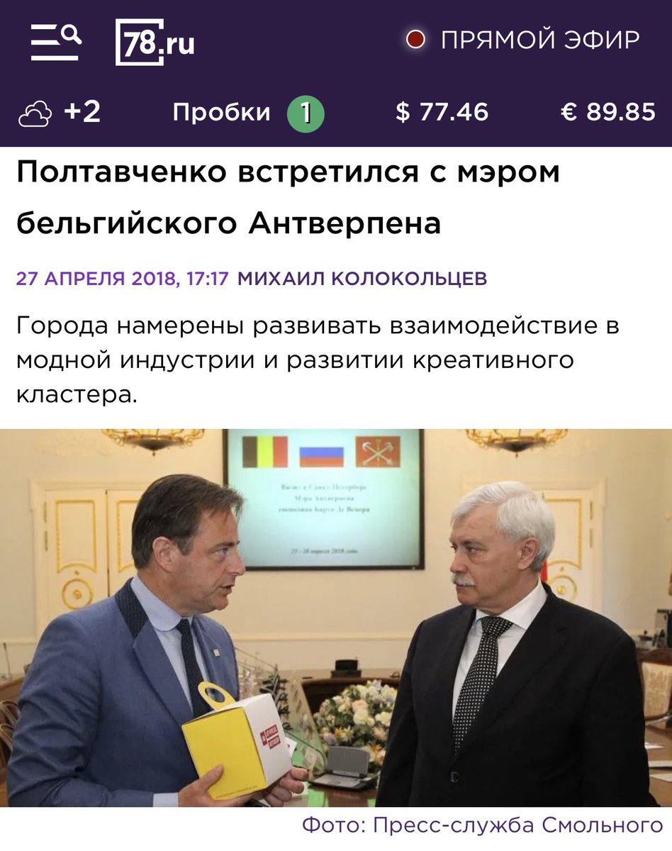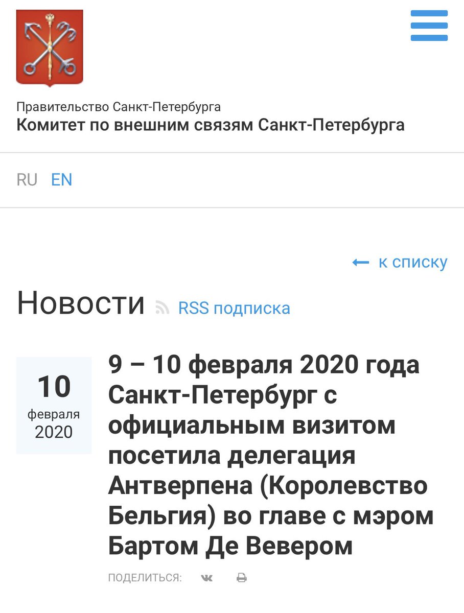 During the trip, Bart De Wever, mayor of Antwerp in Belgium, met with the governor of St. Petersburg (2011–2018), Georgy Poltavchenko, who had served in the Committee for State Security (KGB) since 1979 and worked in the administration of the Federal Tax Police Service for St. Petersburg.