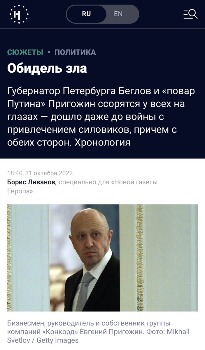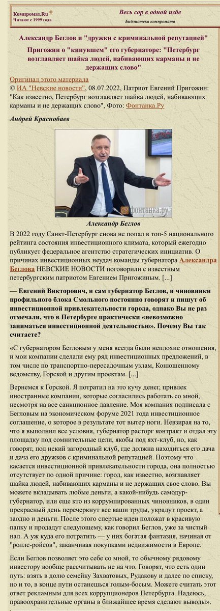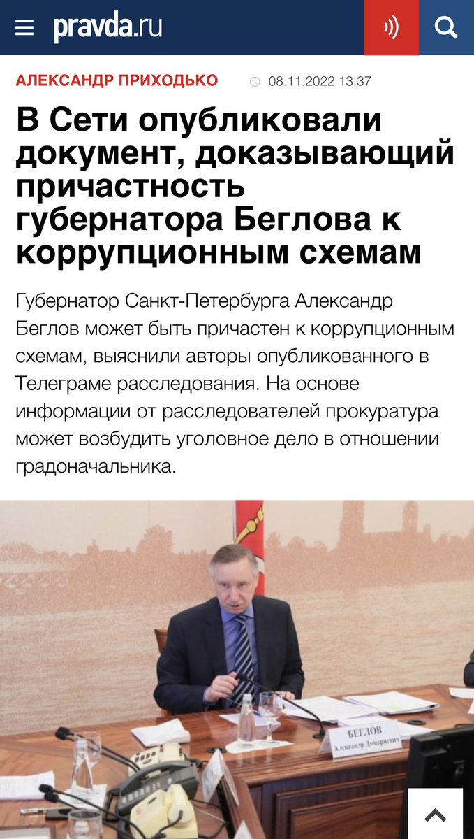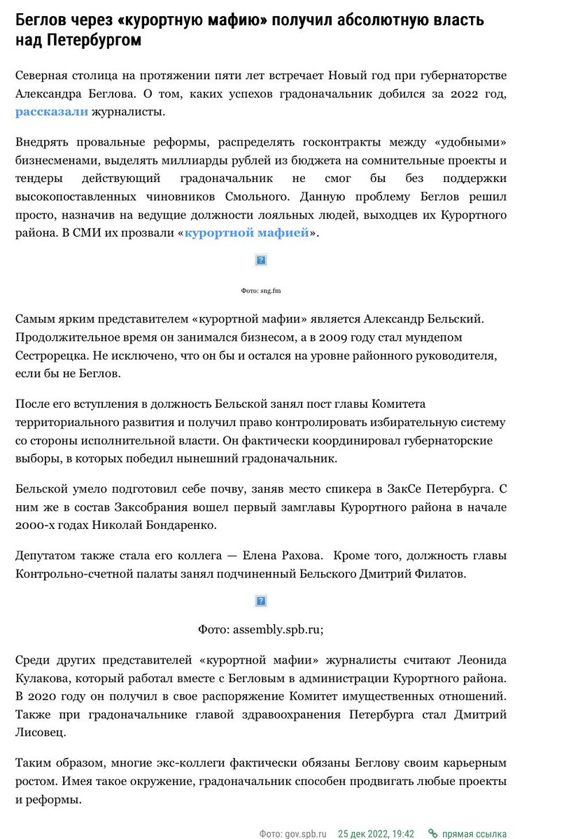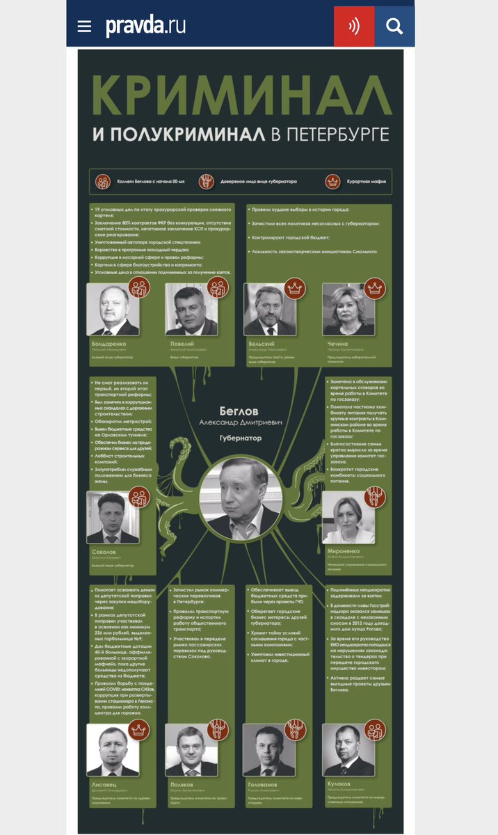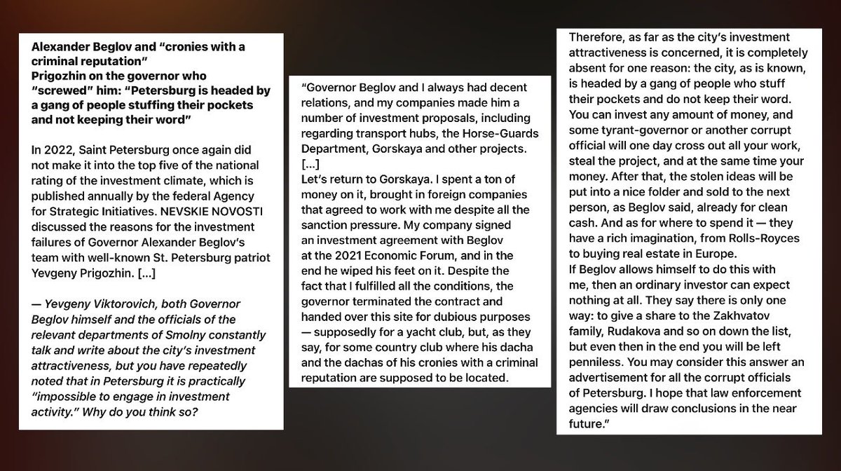 In 2022, a public conflict escalated with mercenary leader Prigozhin, who was himself involved in criminal activities. Prigozhin filed an official complaint with the Prosecutor General’s Office, calling for an investigation on suspicion that Beglov had established an “organized criminal group” to plunder St. Petersburg’s state budget and enrich corrupt officials in his circle.