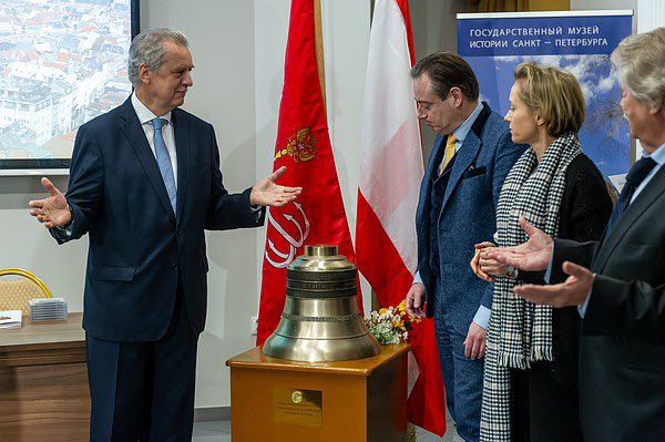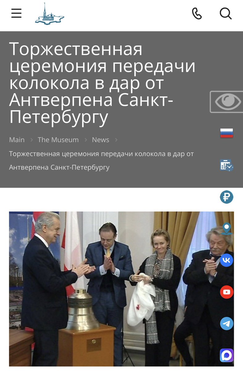 The central event of the visit was the ceremony for the donation of a carillon bell from Antwerp to St. Petersburg: “The bell symbolizes solidarity.” The musical accompaniment for the ceremony was provided by a trio from the Antwerp Symphony Orchestra. The ceremony was attended by Yevgeny Dmitrievich Grigoriev, a member of the St. Petersburg government and chairman of the Committee for External Relations.