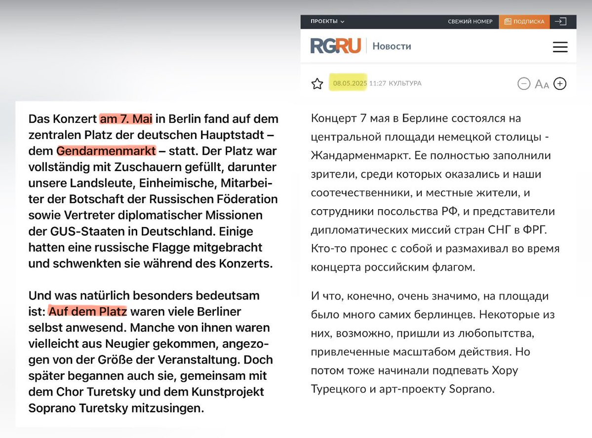 Am 7. Mai 2025 traten der „Turetsky-Chor“ und „Soprano“ in Berlin auf. Das Konzert fand im Rahmen von „Unity Songs“ und der Aktion „Lieder des Sieges“ statt und wurde mit direkter Unterstützung der Moskauer Regierung, von Bürgermeister Sobjanin sowie von Außenminister Sergej Lawrow organisiert.