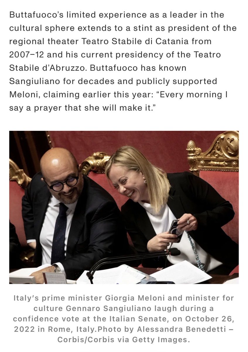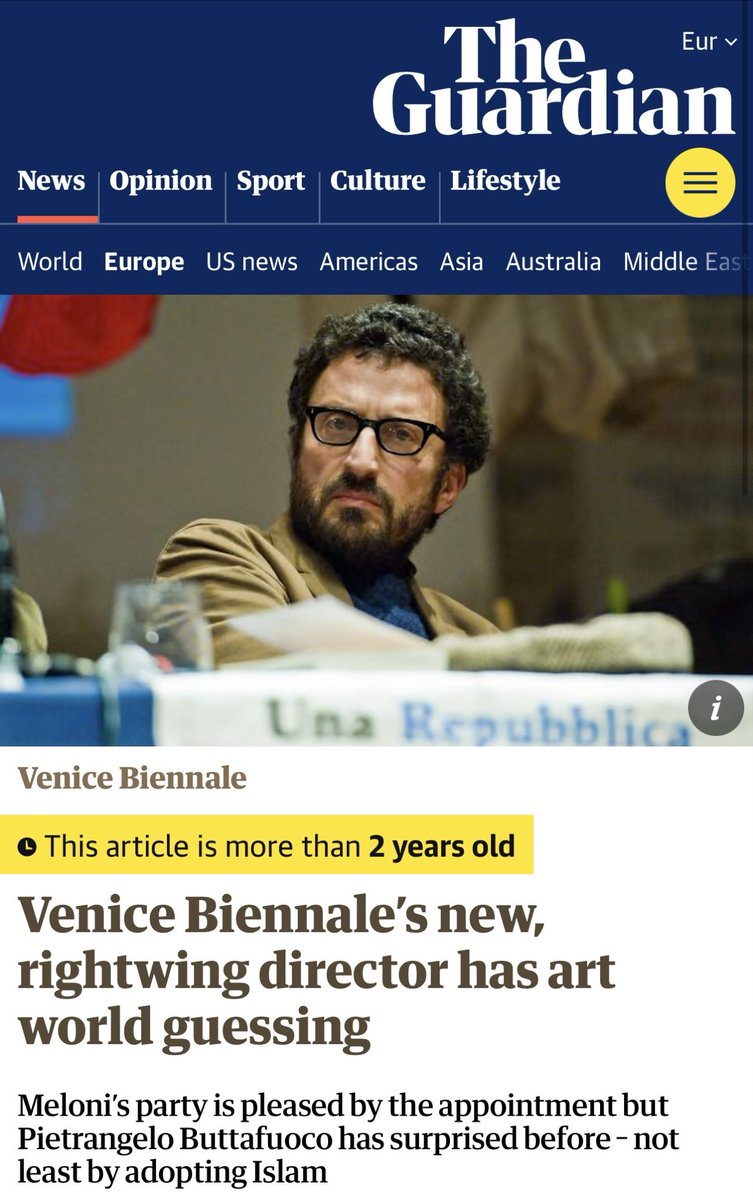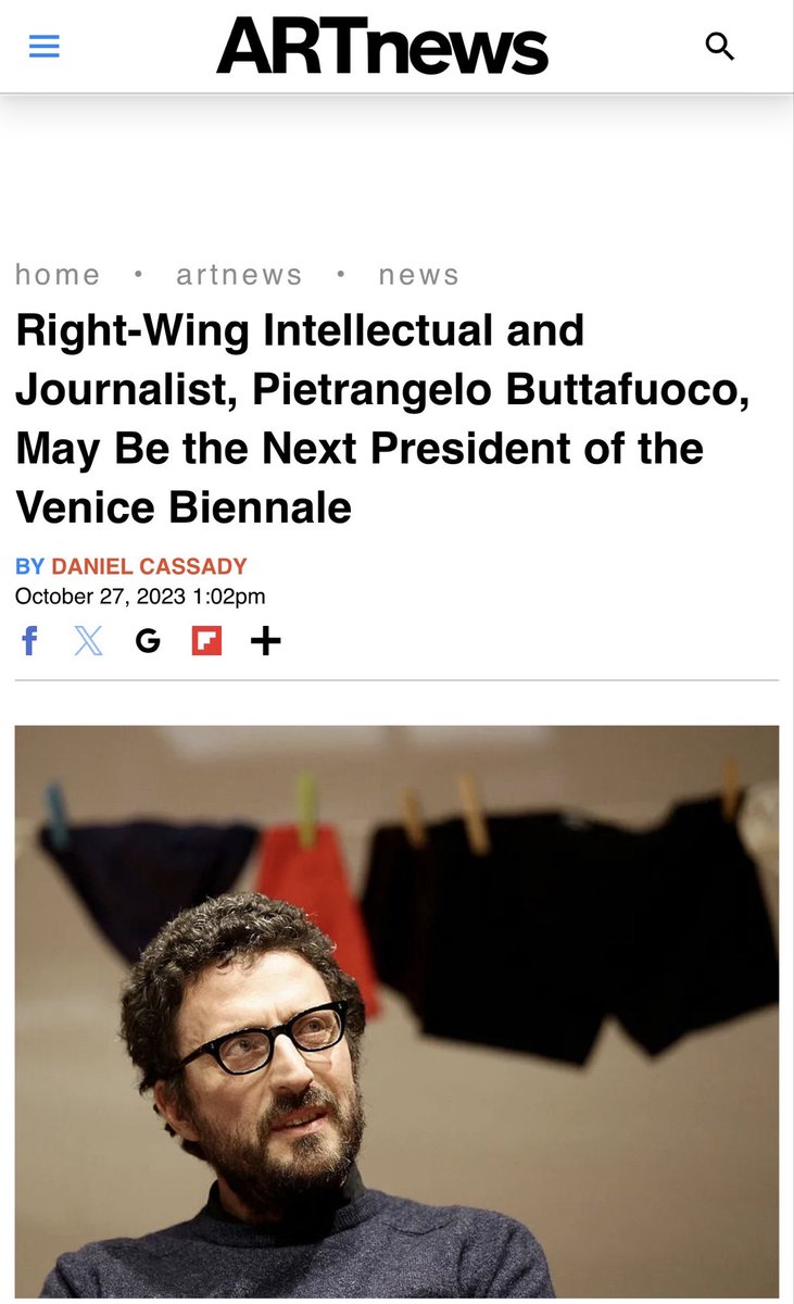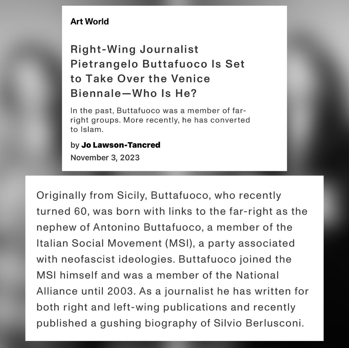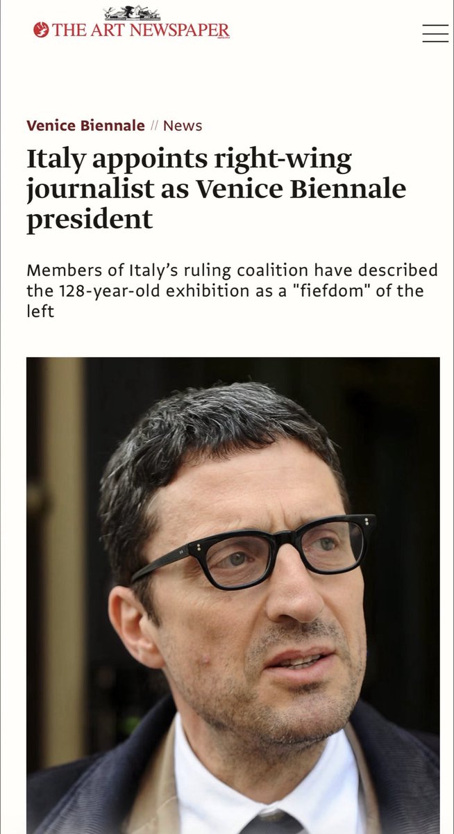 His nomination is seen as “spoils of war” of the Giorgia Meloni government in order to ideologically occupy key cultural positions. Moreover, Buttafuoco has little experience in leading complex international cultural institutions such as the Biennale. His thinking has remained unchanged since his radical beginnings and his core values resemble Putin’s rhetoric.