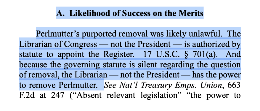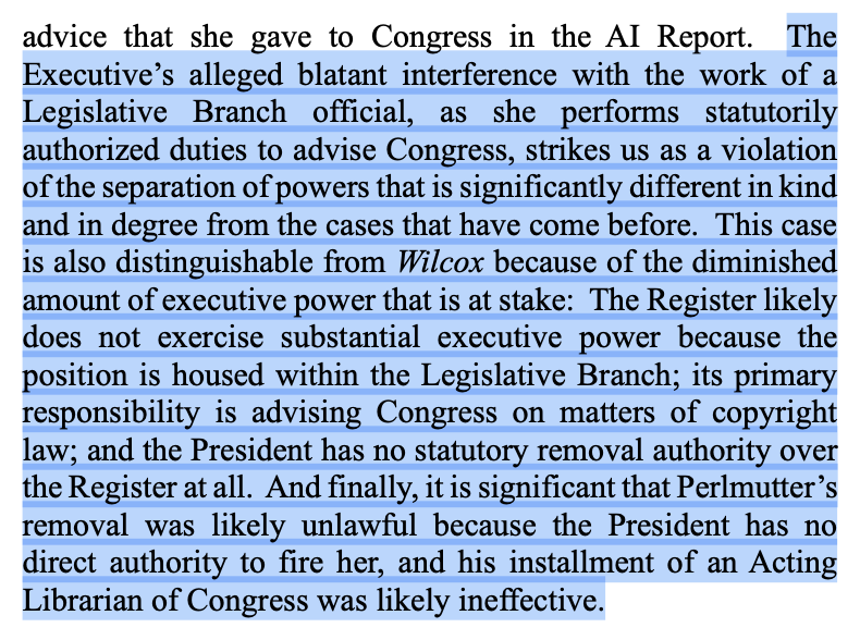 The opinion's perhaps most impactful (and potentially precedentially most important) statement comes 10 pages in as the Court implicitly back's Perlmutter's allegation that her firing constituted, "The Executive's ... blatant interference with the work of a Legislative Branch official....":