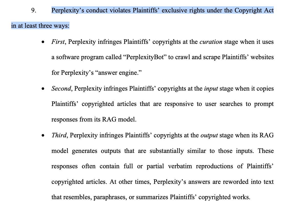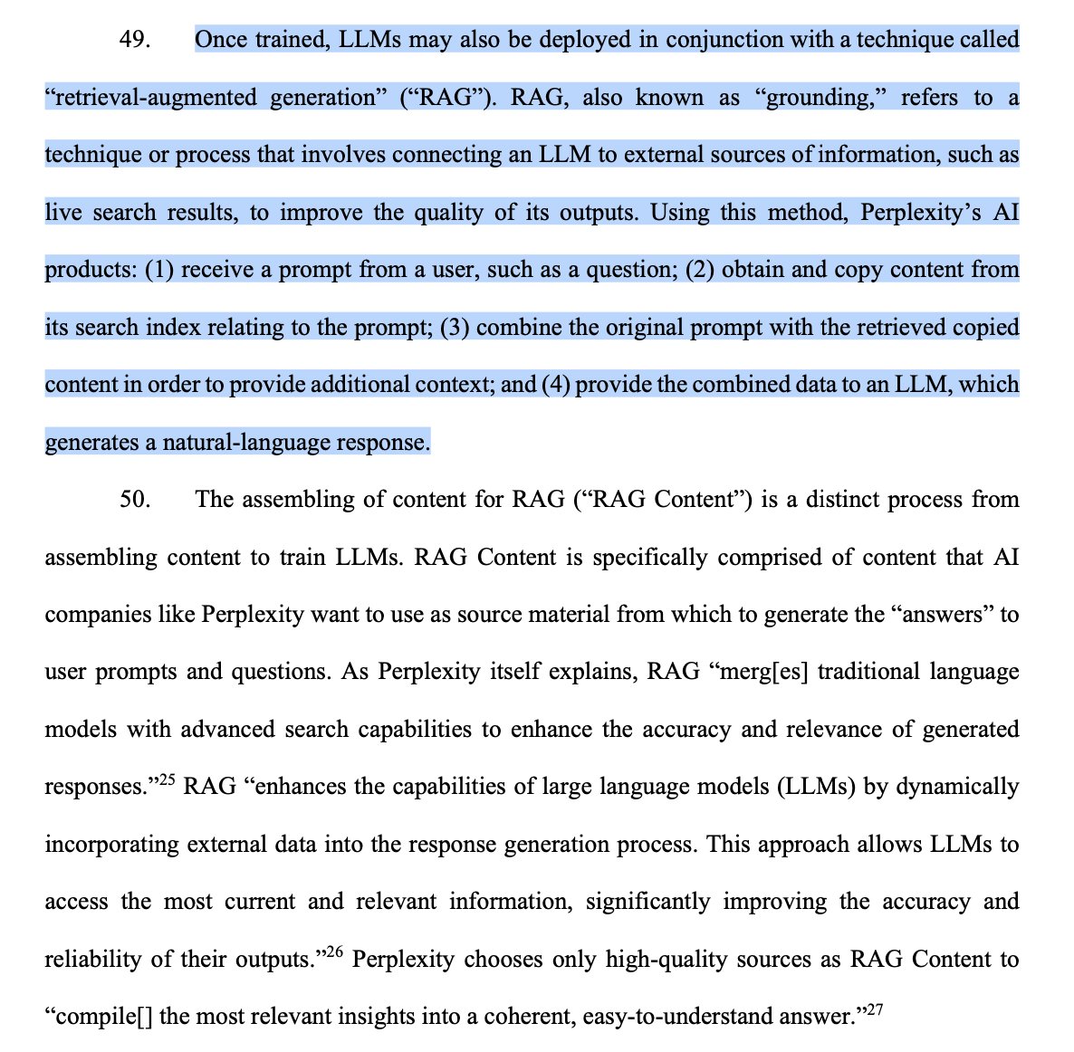 In addition to familiarly claiming that scraping training data from the internet is direct infringement at what it calls the "curation" stage of development, plaintiffs' extensively plead harm from "RAG": retrieval-augmented generation, an advertised hallmark of @Perplexity_AI: