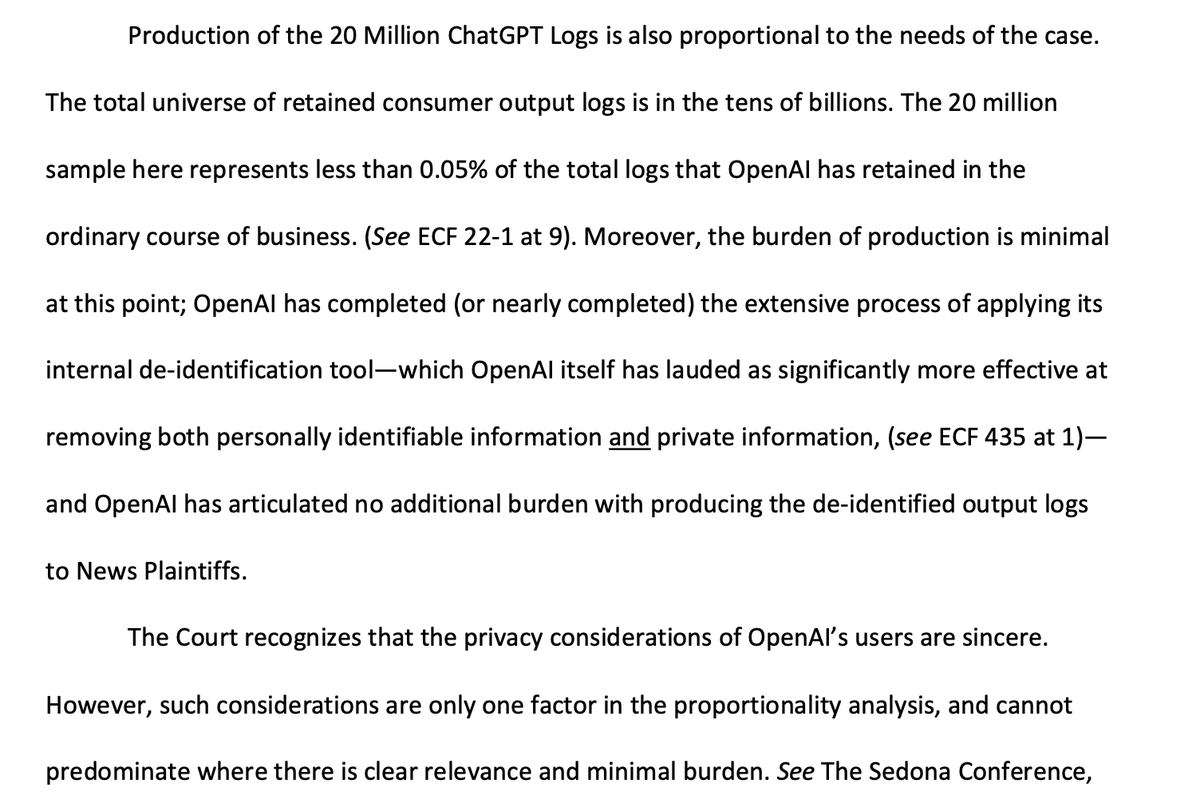 Notwithstanding that that would have sufficed, she also addressed and rejected @OpenAI's arguments that the logs were irrelevant and that demand for them was burdensome and disproportionate: