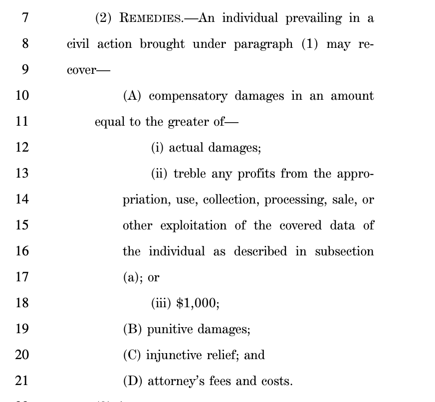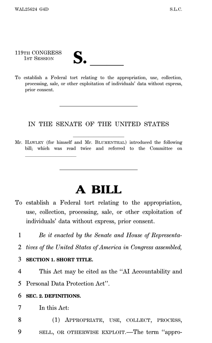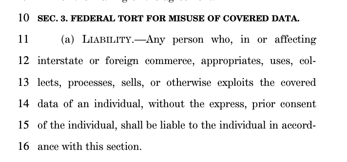 If the sponsors hadn't trumpeted it you might not catch how broad and damaging this bill will be b/c it's optically a personal data protection measure. BUT, it would let anyone with a copyright - registered or not - sue an AI developer for massive damages. Specifically: