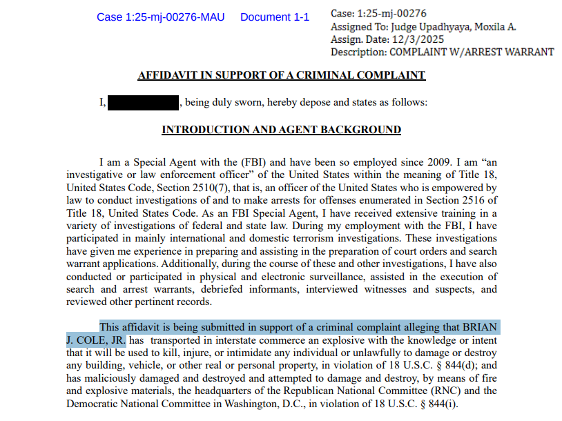 Affidavit in support of criminal complaint against Brian J. Cole, Jr..