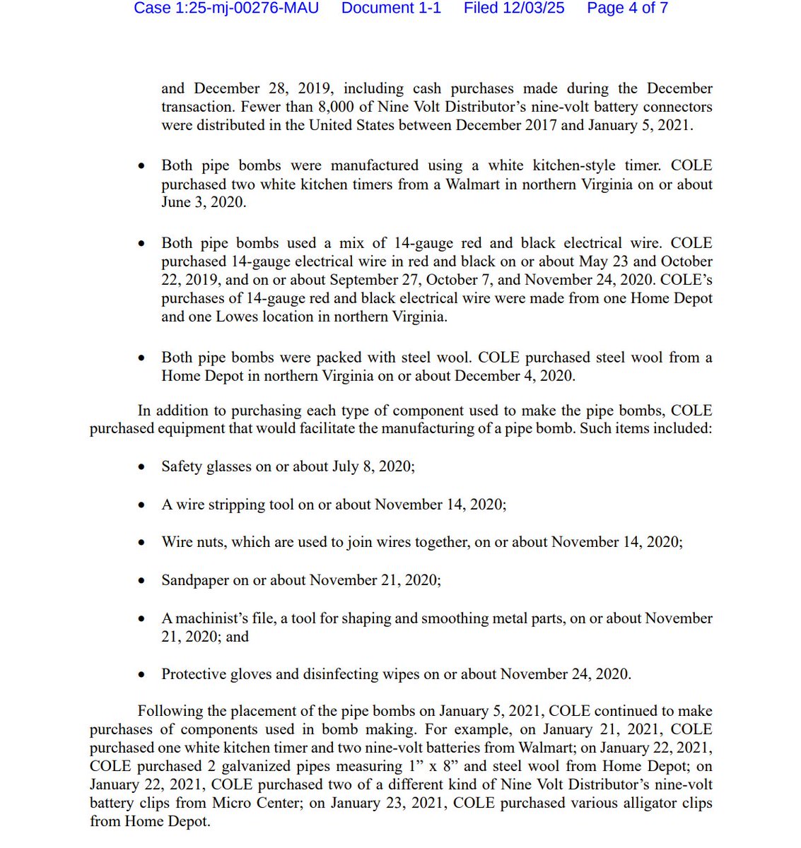 Cole CONTINUED to make purchases of components consistent with making MORE BOMBS AFTER January 5, 2021.