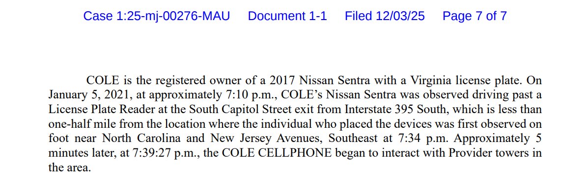 Cole's vehicle was captured on a license plate reader on January 5, 2021, at 7:10pm "less than one-half mile from the location where the individual who placed the devices was first observed on foot..."