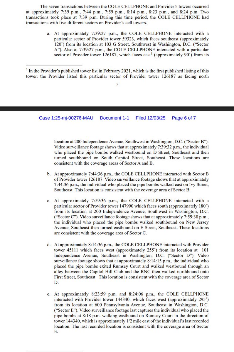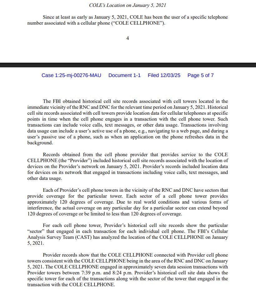 The FBI sorted through cell provider data and identified Cole's cell phone as having been in the vicinity of the DNC and RNC on January 5, 2021.