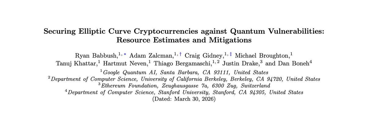 Specifically, this paper. It's a brand new resource estimate that's wildly lower than prior estimates of what it would take to break ECC-256. Featuring the Google Quantum AI team + Justin Drake + Dan Boneh