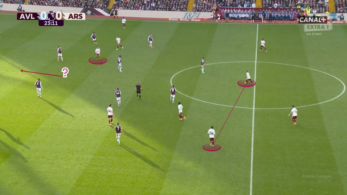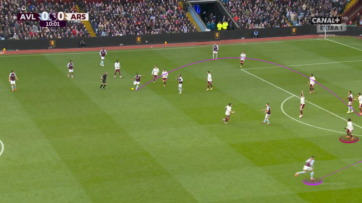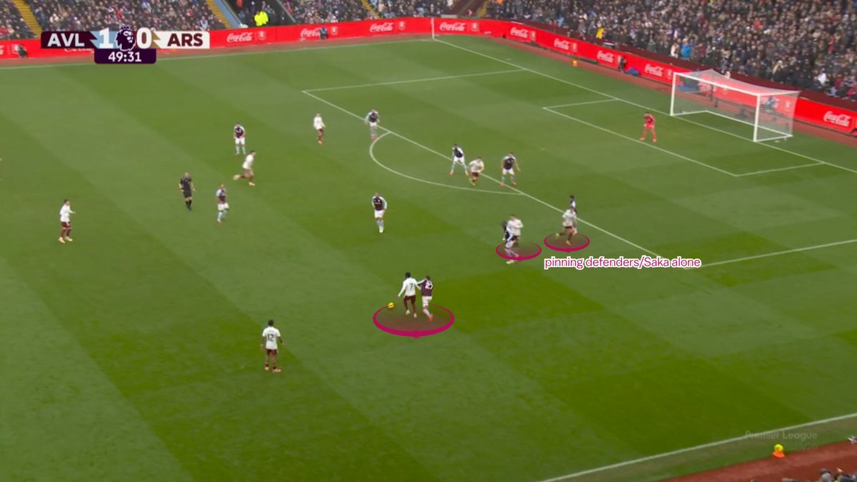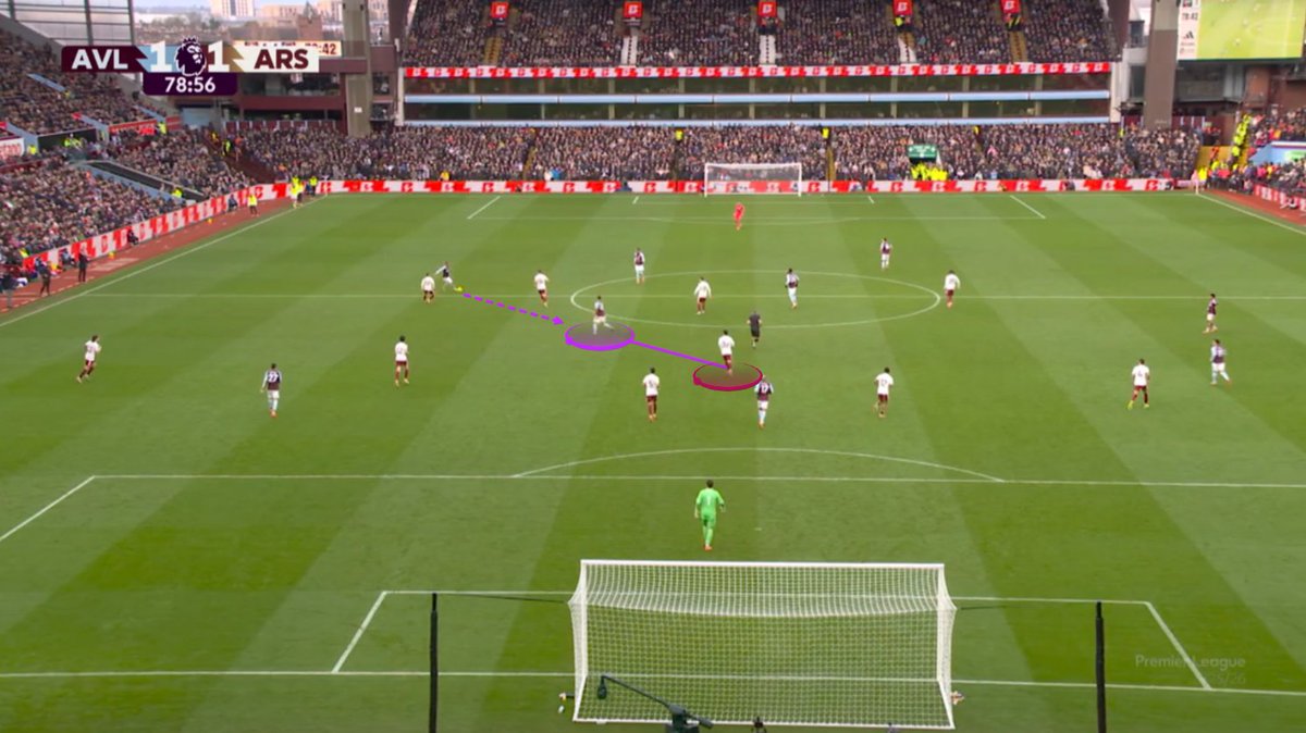The equaliser started with Rice, who dispossessed Onana and caught Villa in transition. Maatsen failed to secure the transition because he was holding the width high up the pitch — which gave Saka an easy starting point. After a neat one-two with Ødegaard, he sent the ball