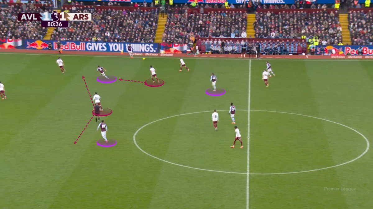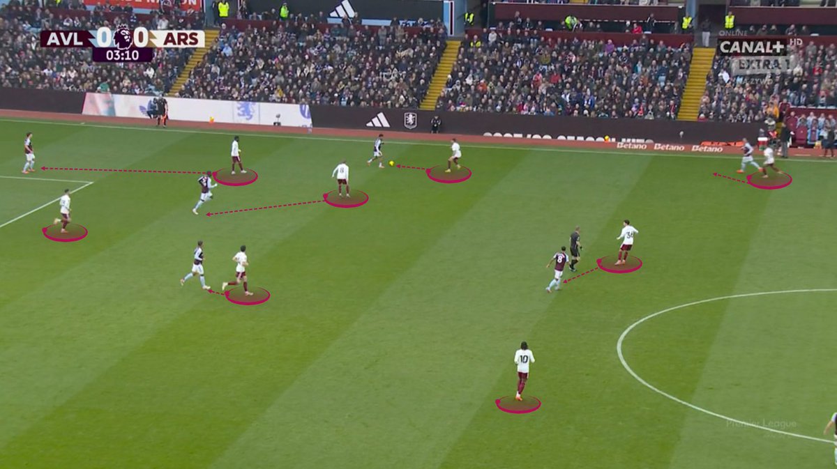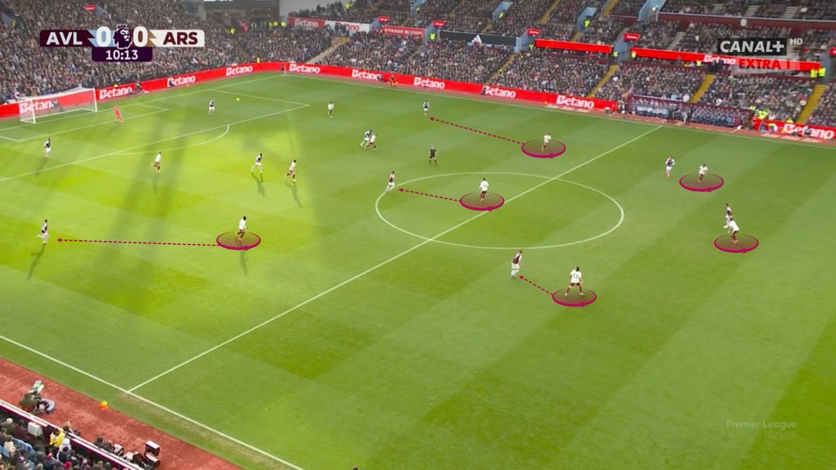 The biggest issue? Once again, central penetration. Arsenal lost their spacing, and Villa played vertically and between the lines at will: Rogers, Tielemans, Watkins/Malen — doing whatever they wanted.