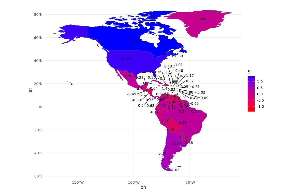 In the same way, we gathered data for the level of development of the same units. For nations, we used the indicators of Social Progress Index and others. For subnational data, we looked for composite indexes made by others. These are usually poverty indexes. These were then averaged to produce a single value. Since these subnational data have no particular scale, we set the weighted mean equal to the country's international mean, and set the SD equal to the ratio of international to subnational HDI SD. It gives this map.