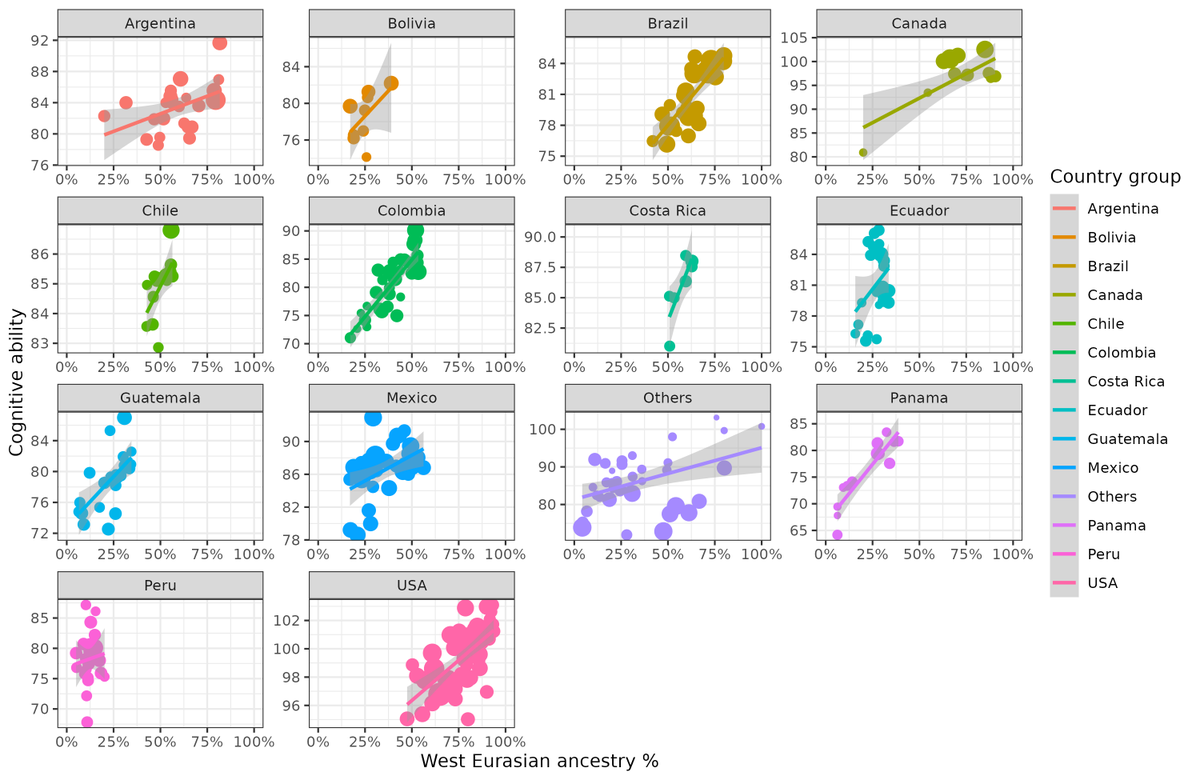 Overall, though, the results were pretty consistent in that ancestry is highly predictive of country level outcomes, and cognitive ability is the chief mediator. Mediation models suggested about 50% mediation.