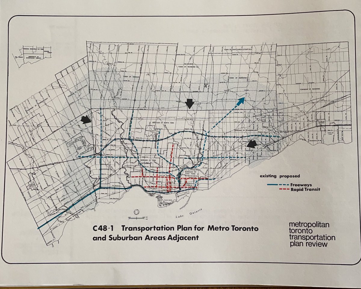 Before I finally have to return these to the library, I thought I’d tweet some images from these old reports, like these maps of old plans collected for the Metro Toronto Transportation Plan Review in 1973. Here is a map of the master plan from 1943.