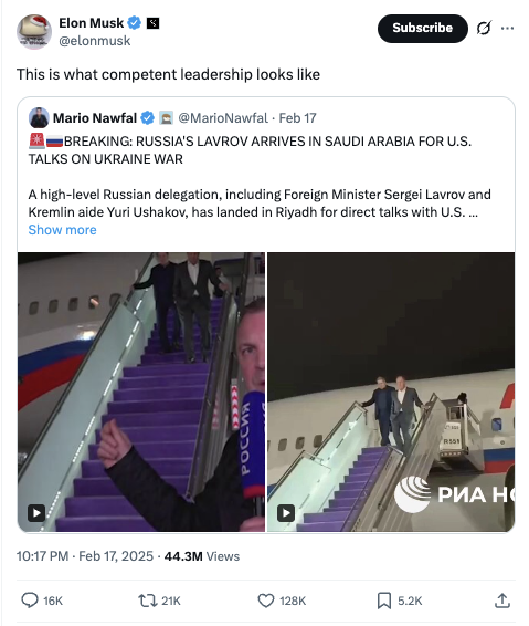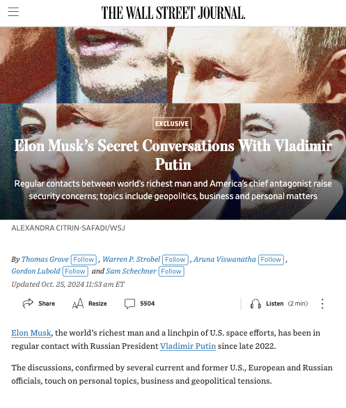 And does Musk have the best intentions? Is he immune from bias and foreign influence? While his father openly attends pro-Kremlin events, Musk praises Lavrov and passed out drunk in Moscow. His conversations with Putin, his pitching of verbatim vatnik talking points like…