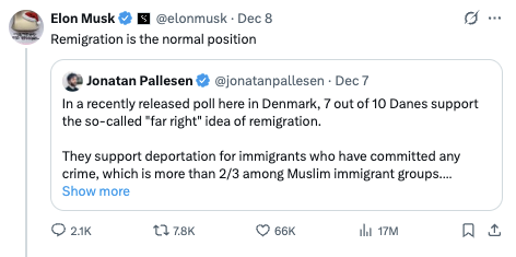 Except for a few restrictive visas for employees who then can’t quit his companies, Musk opposes immigration and supports various far-right parties (yes even Grok corrected him there), who always happen to be pro-Kremlin as well. “Remigration” — except for Elon, of course.