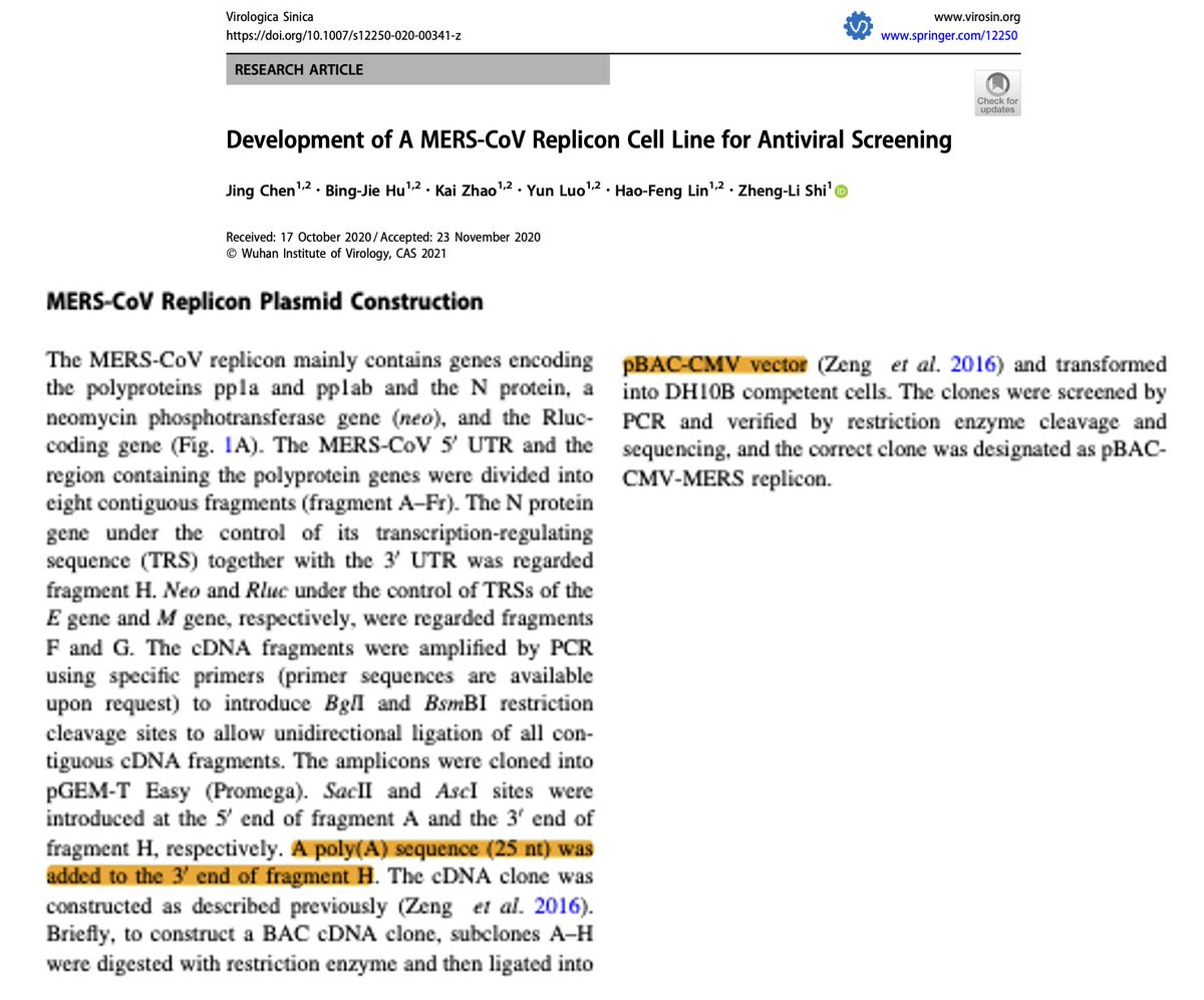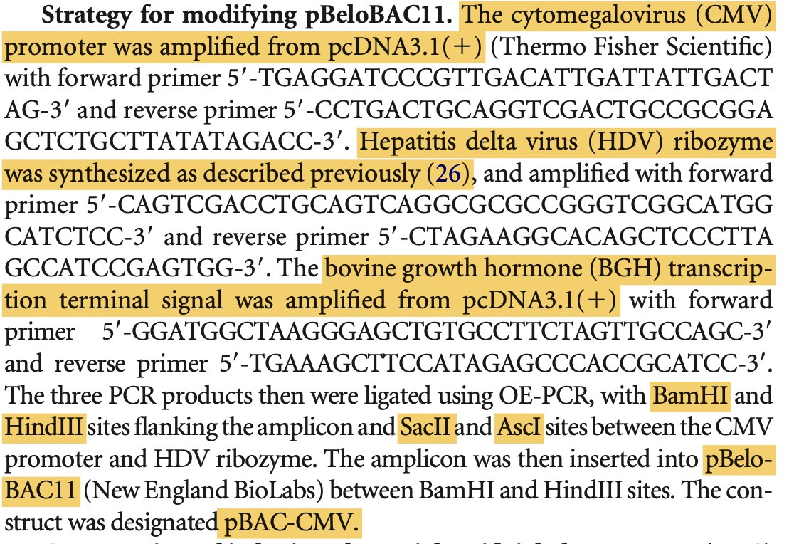 22/ Using the description of pBAC-CMV in Shi's 2016 paper 👇 it can be shown that the use of pBelo-BAC11 as a backbone, restriction sites (with 1 difference), CMV, HDV and BGH sequences, and PCR primer sites perfectly match those in the HKU4r-HZAU-2020 IC