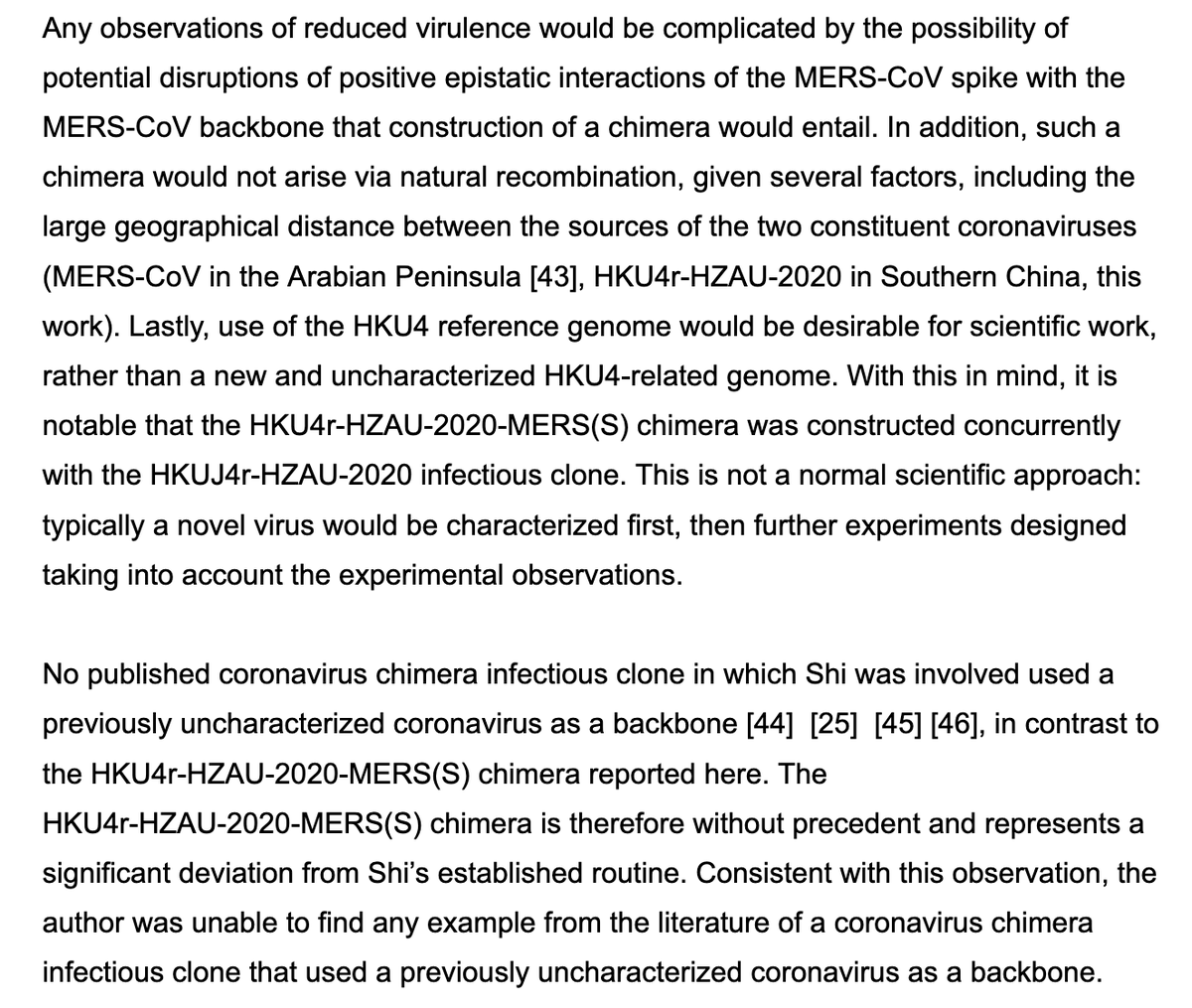 45/ Given these 3 factors, Shi would therefore have been aware of the risk of inserting MERS-CoV spike into a HKU4-related backbone, and that such a chimera would have represented dangerous GOF, as the new spike would have enhanced the human infectivitiy of HKU4r-HZAU-2020