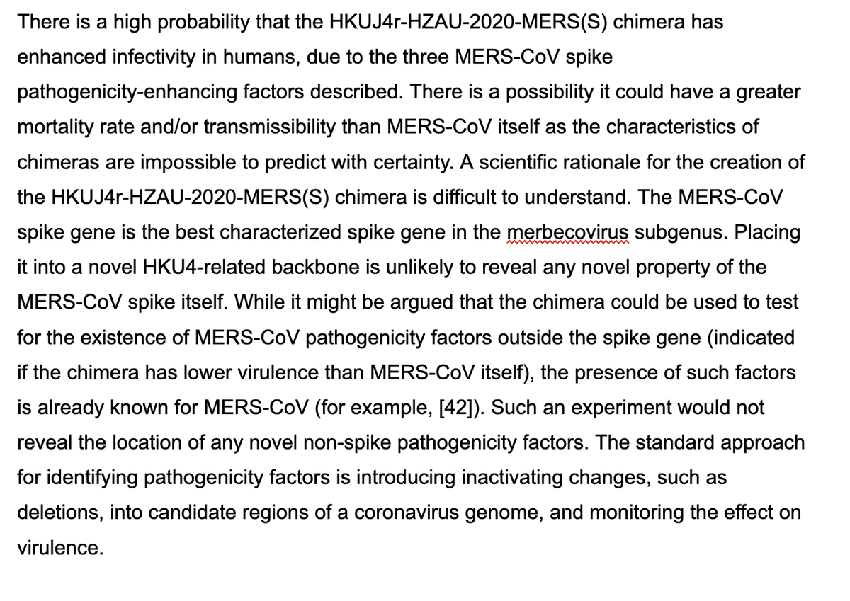13/ The presence of each of these 3 features mean that insertion of the MERS-CoV spike into the HKU4r-HZAU-2020 backbone would have a high probability of increasing human infectivity of the chimera, and so represents dangerous GOF