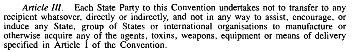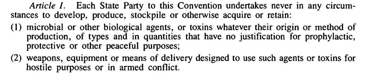 Given no protective benefit to its construction, it appears to violate Article I of the Biological Weapons Convention (BWC) ihl-databases.icrc.org/en/ihl-treatie…